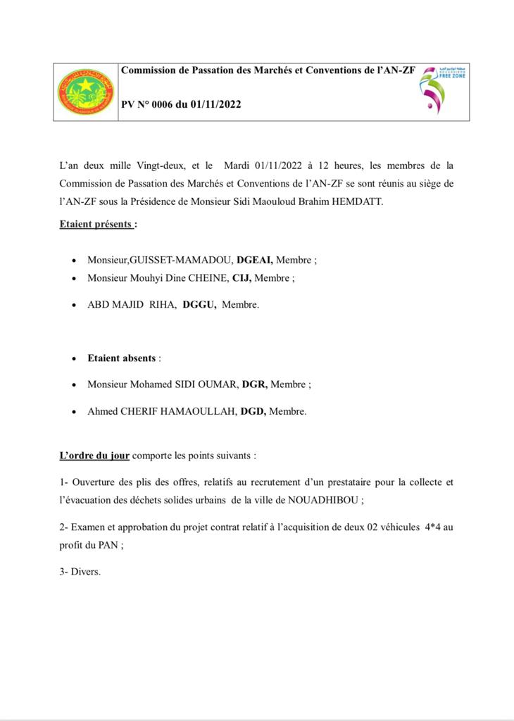 CPMC- PV de l’ouverture des plis relatif au recrutement d’un prestataire pour la collecte et l’évacuation des déchets solides urbains de la ville de Nouadhibou. Post published:16 novembre 2022 Post category:Actualités Facebook Twitter LinkedIn Vous devriez également aimer Plan prévisionnel de passation des marchés PAN 2023 26 juin 2023 Réunion ordinaire du conseil d’administration de l’autorité de la zone franche de Nouadhibou 19 octobre 2022 Avis de report STEP 21 mars 2023